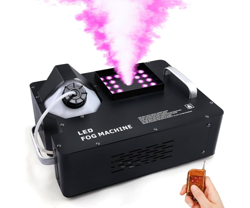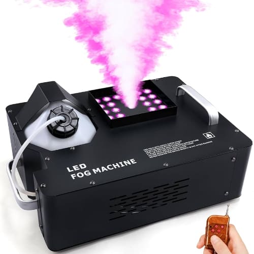 This more powerful fog machine adds professional‑grade fog output alongside DMX‑controlled RGB lighting, making it a strong choice for stage shows, clubs, or events needing synchronized fog and light effects.